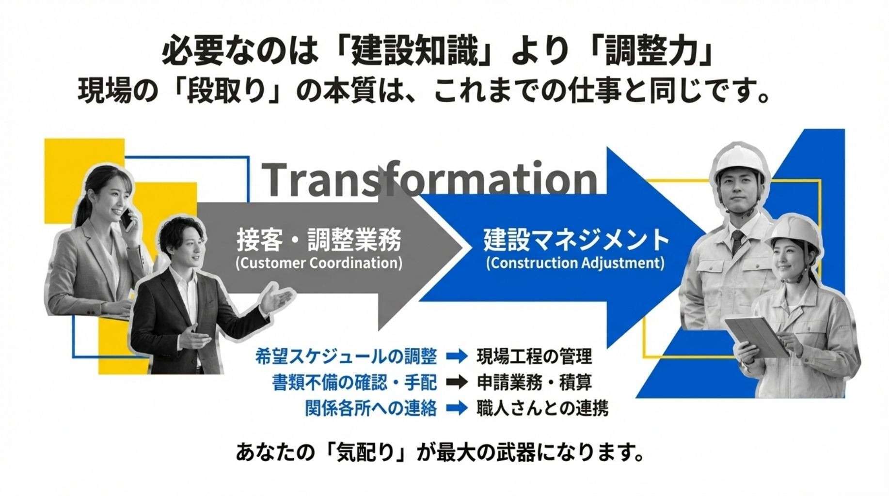 ですが、断言させてください。これまでの事務職で培った「人と関わった経験」は、そのまま建設業の即戦力になります。