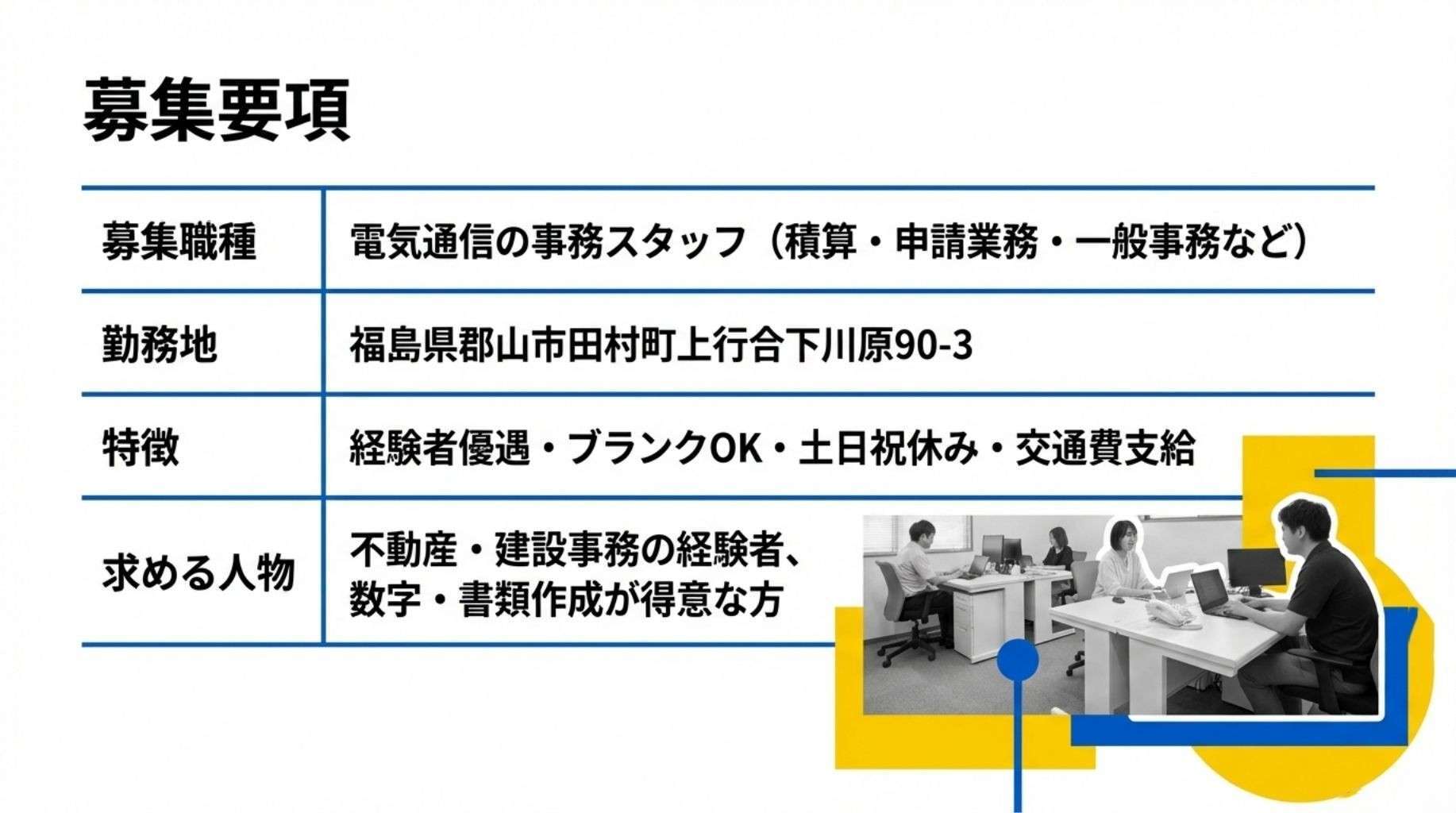 現在、事業拡大に伴い、バックオフィスから現場を支えてくれる事務スタッフを募集しています。