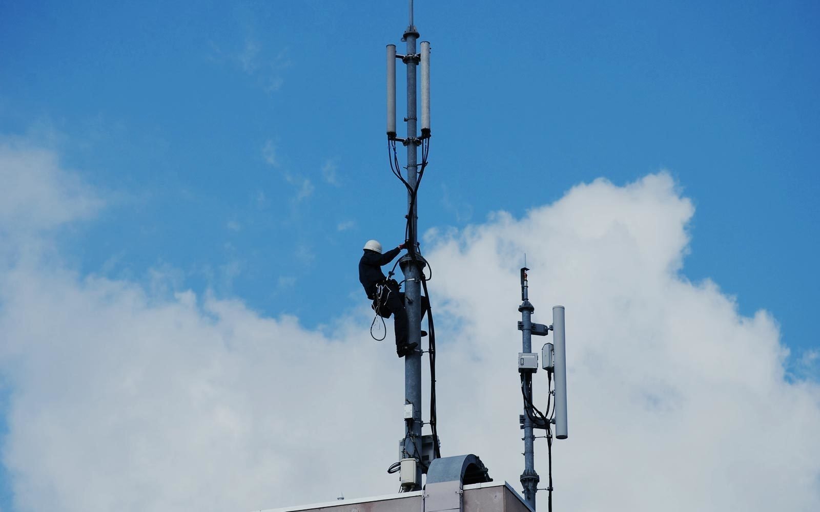 ビルやマンションの屋上、電柱、鉄塔の上に通信設備を設置する仕事です。